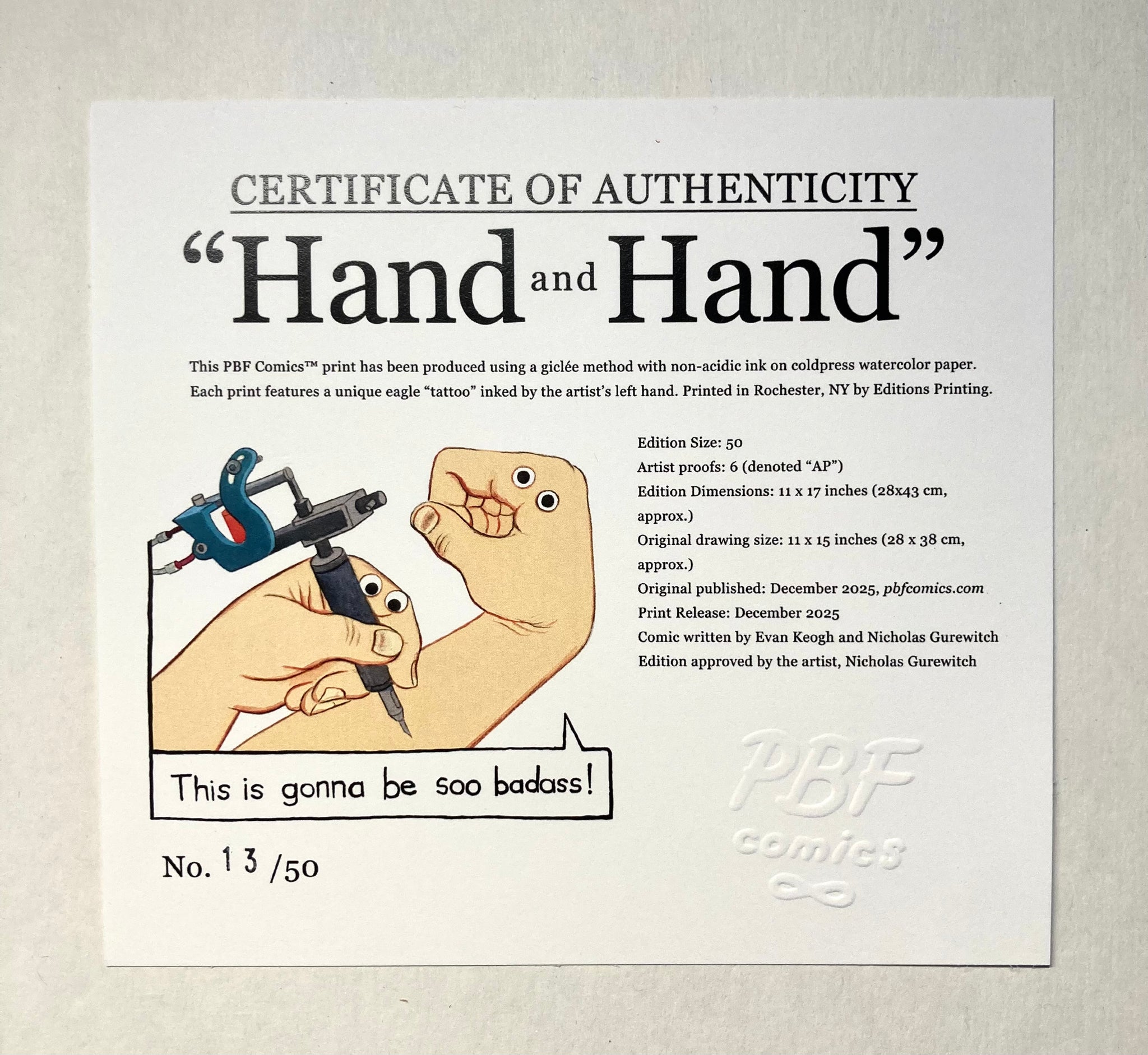 There will be no subsequent production of this artwork outside of book publication. Print production is limited to only 50 prints and 6 artist proofs (denoted with “AP”)